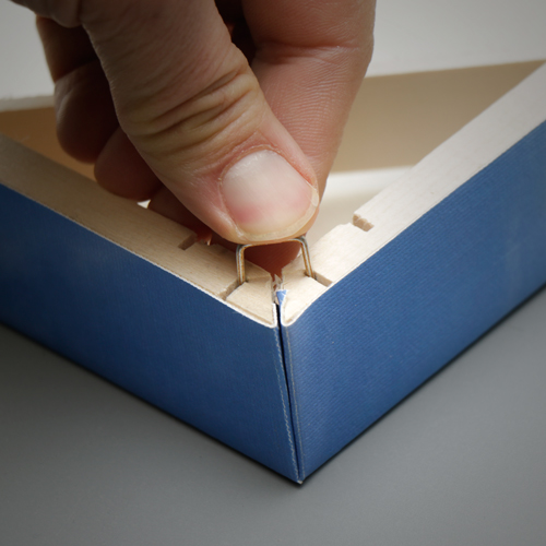 U-shaped fasteners allow the canvas to fold into the miter creating neat and perfectly folded corners. They are easy to apply by just pressing them into the wood with your hands; no machine is needed.