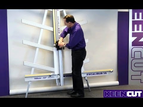 We have already set-up the Excalibur 3S using Keencut's quick precision 90 degree squaring system and by adjusting the telescopic legs. The material stands easily on the one piece squaring arm. There are two ways to set-up for your cut. Use the [cycline 00:00:48] strip for cutting accurately to crop lines or use the production stops when cutting to size. Keencut's unique full length pressure sensitive clamp provides maximum clamping to hold tough materials precisely for a perfect cut.
