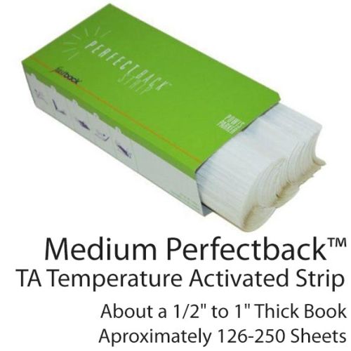 The collection of Fastback® Perfectback™ binding strips are unique, in that they allow you to use your own custom wrap-around cover without any specialty perfect binding equipment. Instead, just pair with your Model 20 tape binding machine. These particular tape binding strips are called Perfectback™ TA strips, which stands for "temperature activated", meaning that the adhesive on them is activated by the heat of your machine. Because these book strips require heat, it is not recommended for heat-sensitive covers or documents. Your cover is bound securely to the spine of your book block when you buy Fastback® Perfectback™ TA strips online. Perfect back strips are available in either narrow, medium, or wide strip widths for different capacity books, and are 11" long for standard letter size paper.